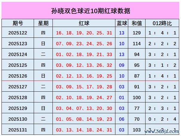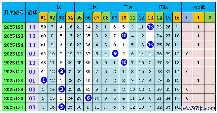 上期追溯:双色球第2025131期开出奖号:红球03、13、14、18、24、31;蓝球03,其中红球和值为103,012路比为3:2:1,奇偶比3:3,蓝球开出小奇数号码03。