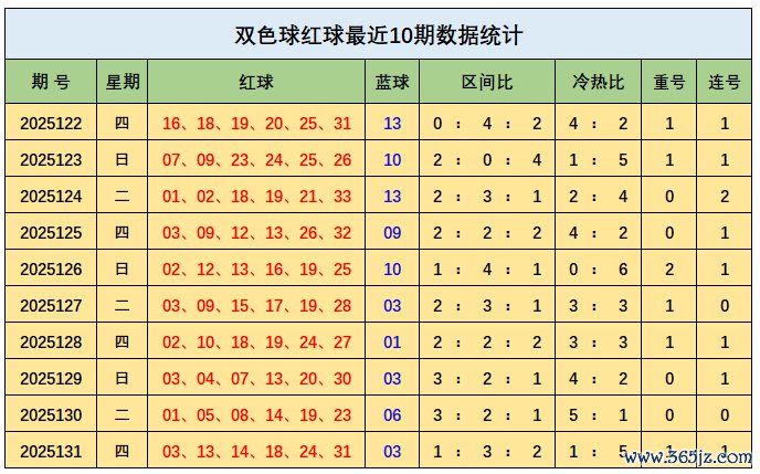 上期记忆:双色球第2025131期开出奖号:红球03、13、14、18、24、31;蓝球03,其中红球三区比为1:3:2,开出1枚重号14,开出1组连号13、14,蓝球开出一区号码03。